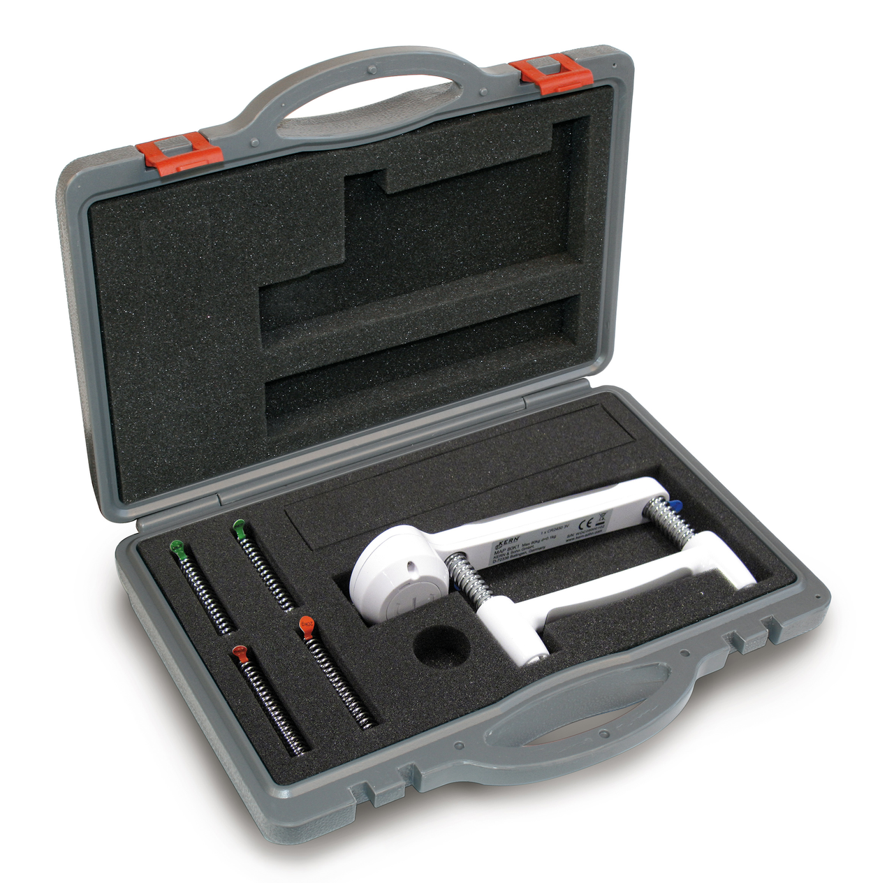 - Auswechselbare Federn ermöglichen schnelles Ändern der Kapazität (zusätzliche Federsätze im Lieferumfang enthalten). Durch die unterschiedlichen Härtegrade der einzelnen Federn ist der Handkraftmesser universell bei den verschiedensten Patientengruppen einsetzbar, wie z. B. bei Kindern, Senioren oder in der Sportmedizin