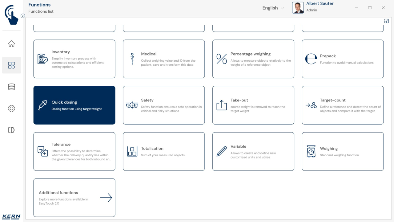 • Software à la carte: EasyTouch kann je nach individuellem Bedarf zusammengestellt werden. Immer erforderlich für den Betrieb von EasyTouch ist das Basisprogramm SET-01 Base. Auf dieser Grundlage können alle KERN EasyTouch Funktionen betrieben werden, solange sie nicht weitere Funktionen zur Basis haben. Das bedeutet, dass EasyTouch kosten- und aufwandseffizient so schlank konfiguriert werden kann, wie es den individuellen Bedürfnissen entspricht
