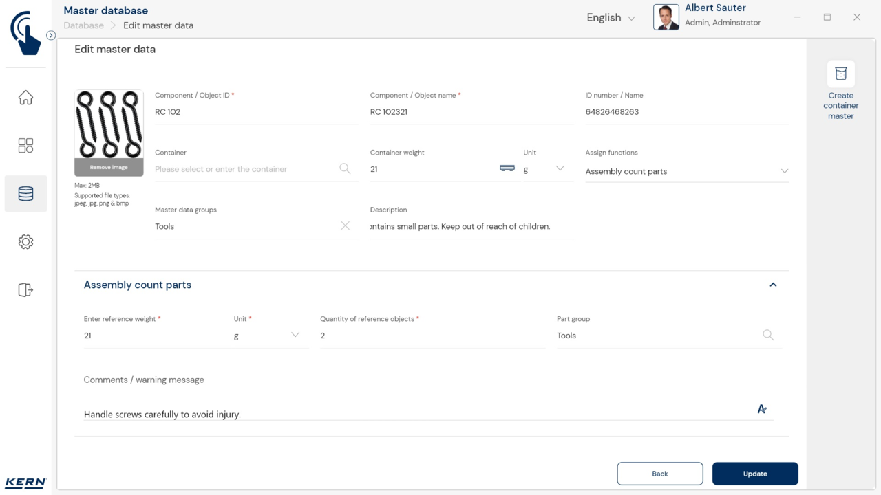 - Jeder Artikel in der Stückliste kann mit eigenen Stammdaten, wie z. B. Referenzgewicht pro Stück oder ID-Nummer angelegt werden. Die ID-Nummer erlaubt das Identifizieren des Artikels per Barcode-Scan. Der Scan erhöht die Sicherheit, keine falschen Teile hinzuzufügen