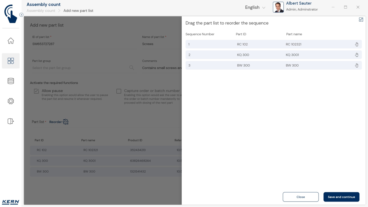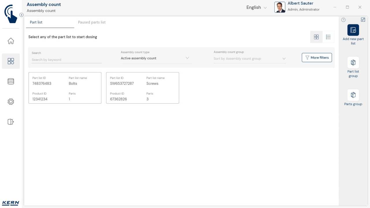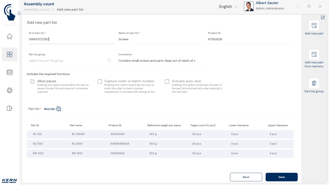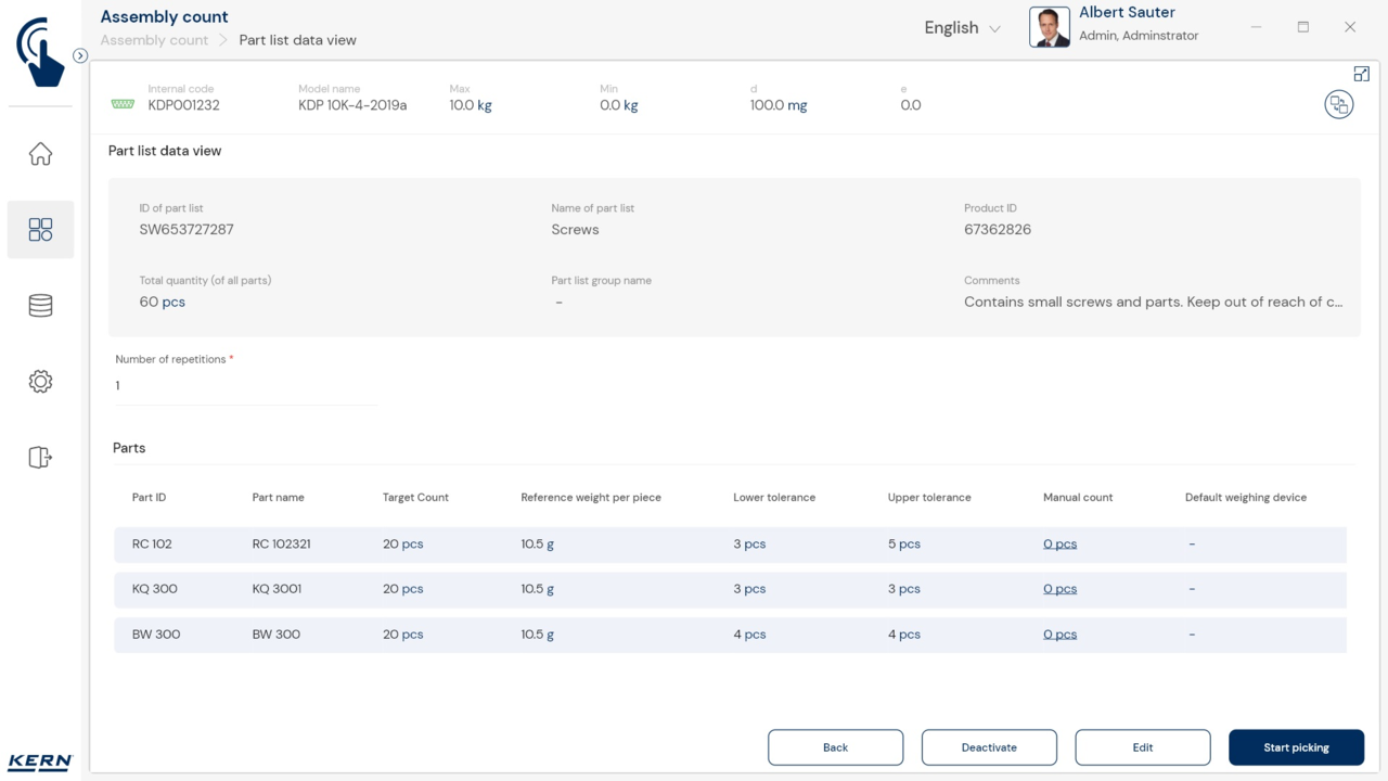 - Durch die Nutzer-Rollen-Verwaltung kann sichergestellt werden, dass die Zielmengen in den Stücklisten nur durch berechtigte Nutzer verändert werden. Da die ausführenden Nutzer zudem physisch richtig gezählte und gewogene Teilmengen abspeichern können, sind Zählfehler im Kommissionier-Prozess weitestgehend ausgeschlossen