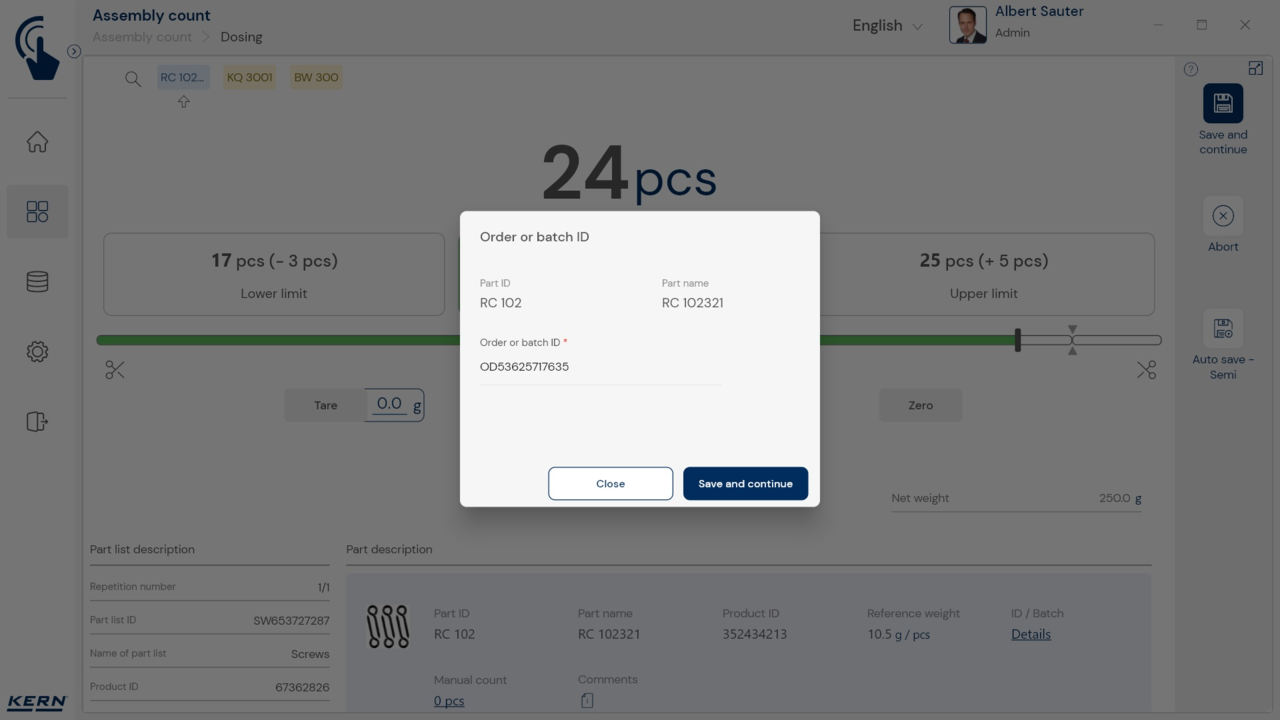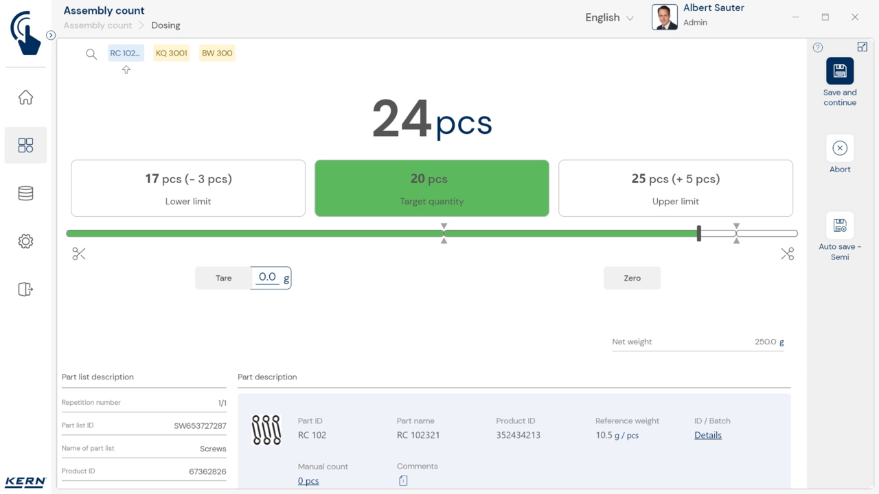 - In der Software kann die Zielmenge mit zulässiger Toleranz je Komponente exakt hinterlegt werden. Durch das ebenfalls bekannte Stückgewicht kann die Software im Verbund mit der Waage die tatsächlich abgezählte Stückzahl schnell kontrollieren und notwendige Mengenkorrekturen anzeigen