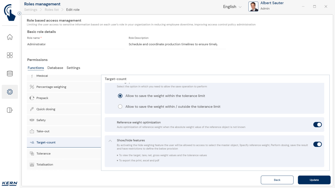 - Flexible Datenschutzoptionen: Je nach Nutzer-Rolle kann ausgewählt werden, ob nur die Ziel-Wiegewerte, oder auch die Bezeichnungen z. B. einzelner Rezepturkomponenten angezeigt werden sollen