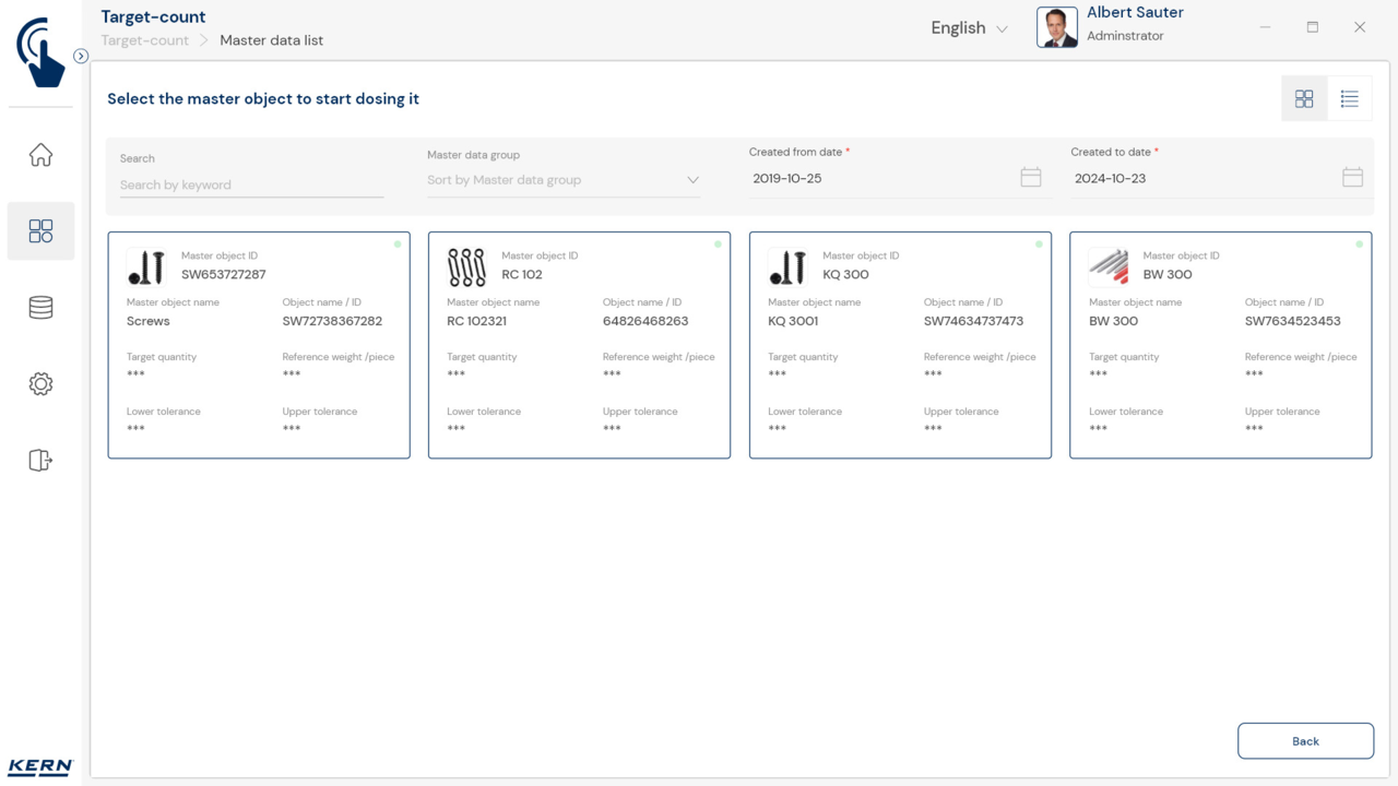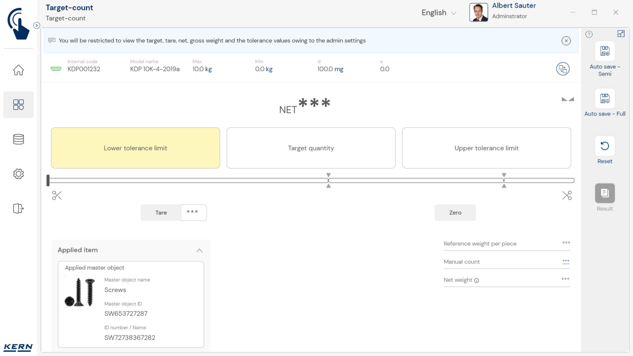 - Schutz sensibler Wiegedaten: Beim Dosieren bzw. Wiegen werden Ziel-Wiegewerte durch „***“ neutralisiert dargestellt, sodass nur das grafisch dargestellte Ergebnis auf Basis des Zielwerts und der unteren und oberen Toleranzwerte sichtbar ist