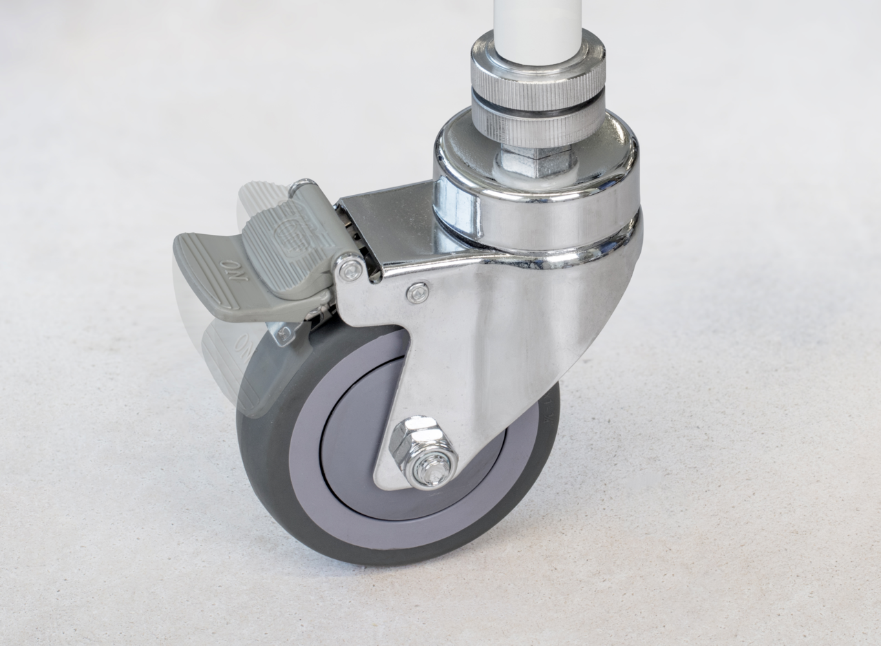 - Fahrbare Ausführung mit zwei lenkbaren Rollen und besonders komfortablen Feststellbremsen hinten
