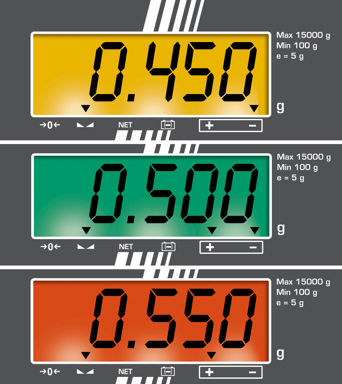 - Innovatives Wiegen mit Toleranzbereich (Checkweighing): Die Farbe des Displays wechselt je nach Wägeergebnis (zu leicht/ok/zu schwer) und unterstützt so das Portionieren, Dosieren und Sortieren