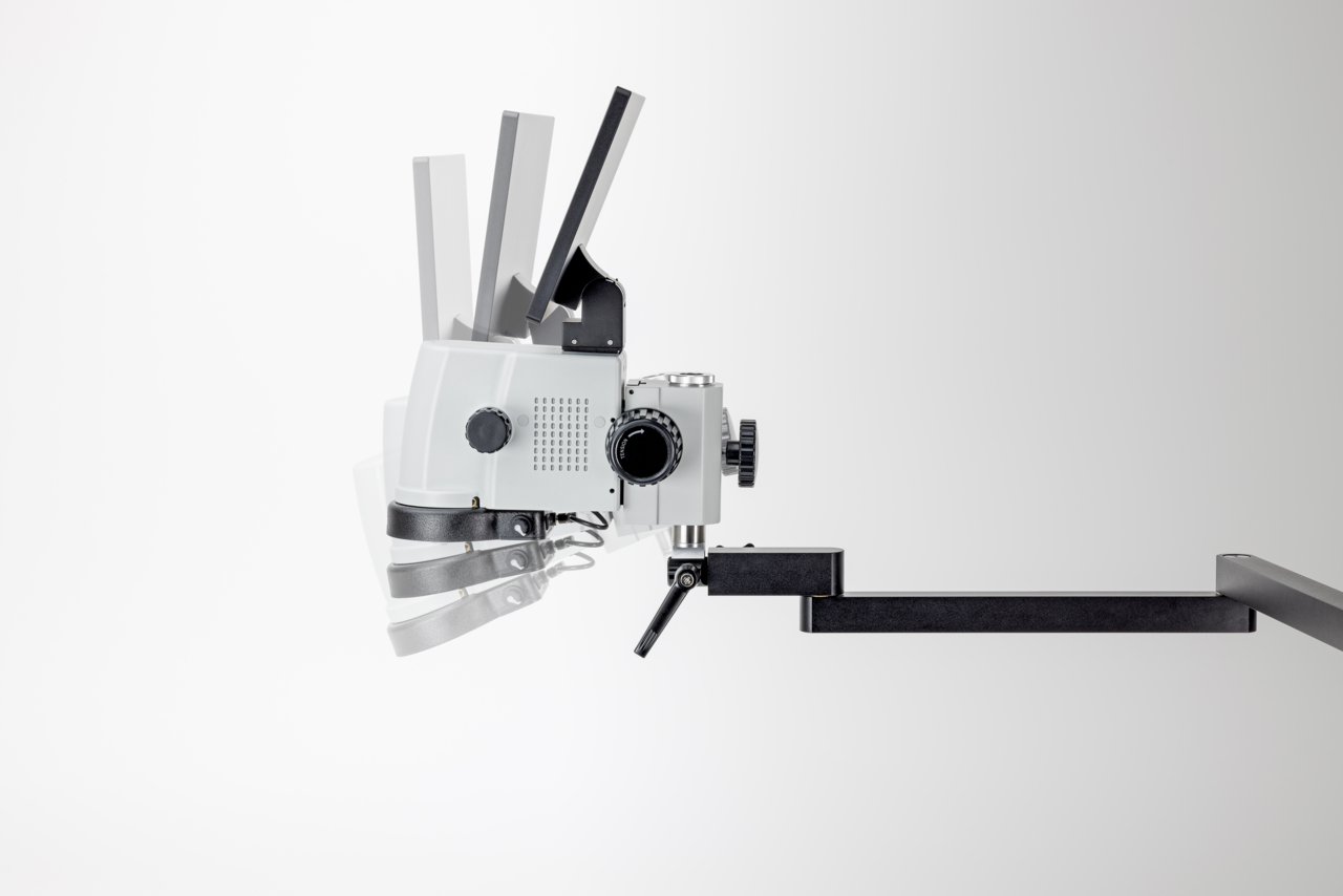 - Der integrierte Universalständer mit Gelenkarm ermöglicht ein flexibles Arbeiten mit unterschiedlichsten Proben, auch mit größeren Arbeitsabständen. Zudem kann das Mikroskop bei Bedarf zur Seite geschoben werden, um Platz zu schaffen