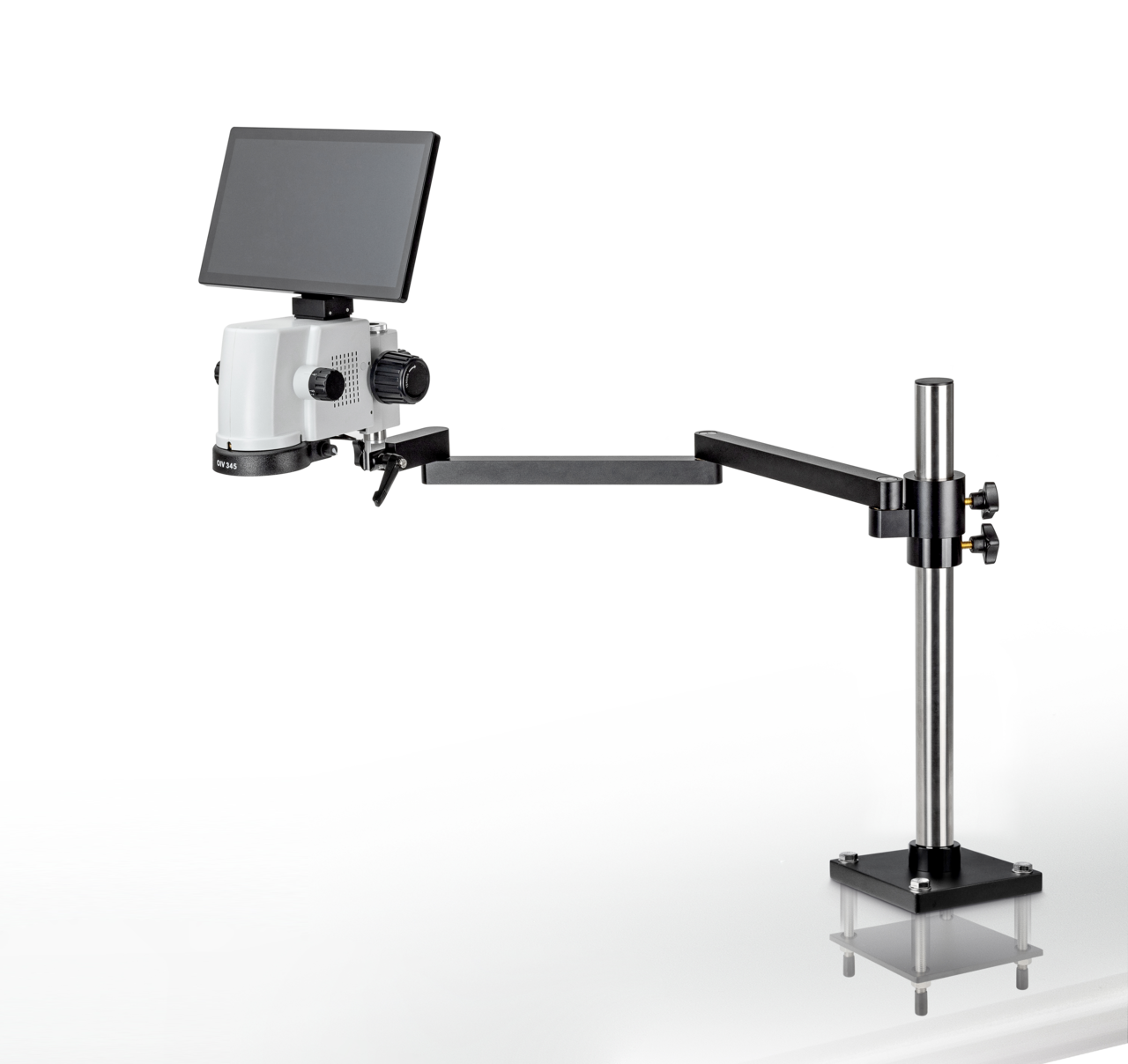 - Der integrierte Universalständer mit Gelenkarm ermöglicht ein flexibles Arbeiten mit unterschiedlichsten Proben, auch mit größeren Arbeitsabständen. Zudem kann das Mikroskop bei Bedarf zur Seite geschoben werden, um Platz zu schaffen