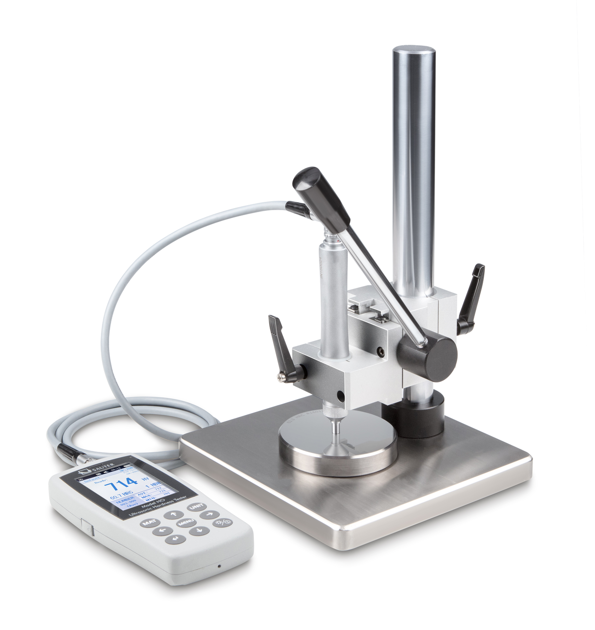 • Leichtgängige Mechanik, Hublänge 34 mm, maximale Höhe des Prüfobjektes innerhalb des Prüfstandes 240 mm, schwenkbarer Prüfkopf für Messungen außerhalb der Grundplatte, sehr robuste Ausführung, Nettogewicht ca. 9 kg