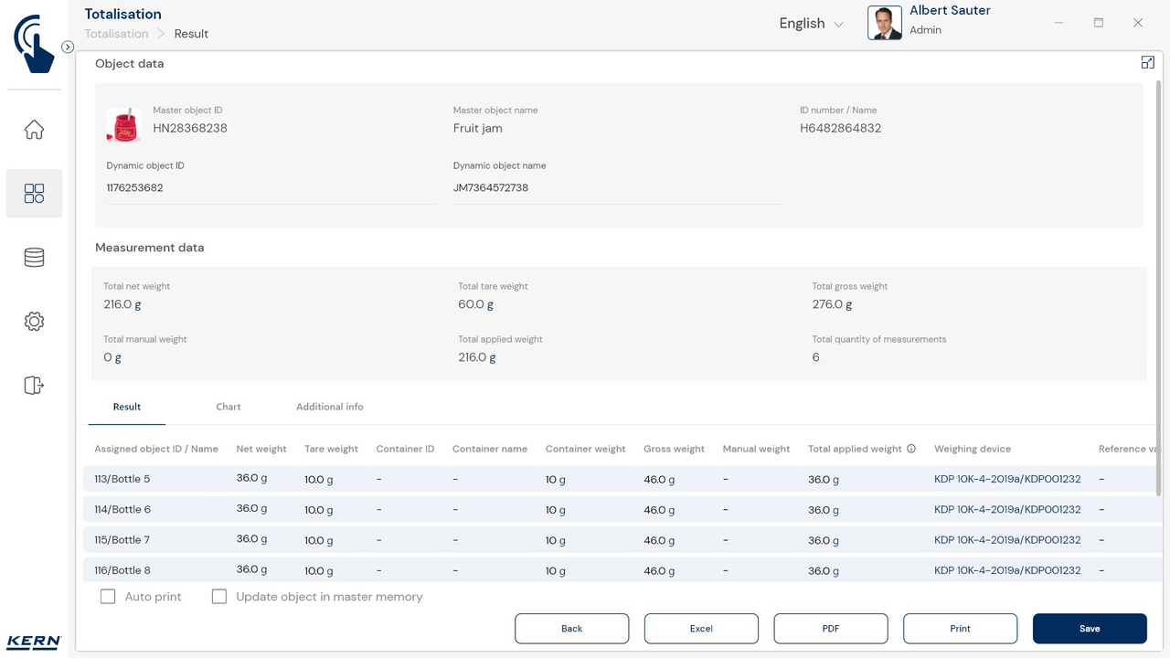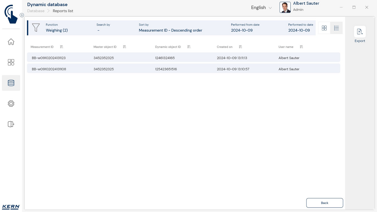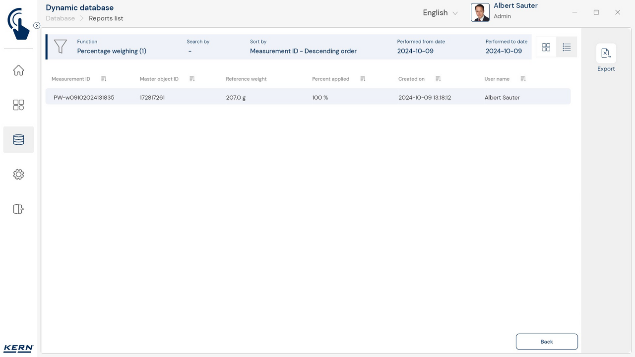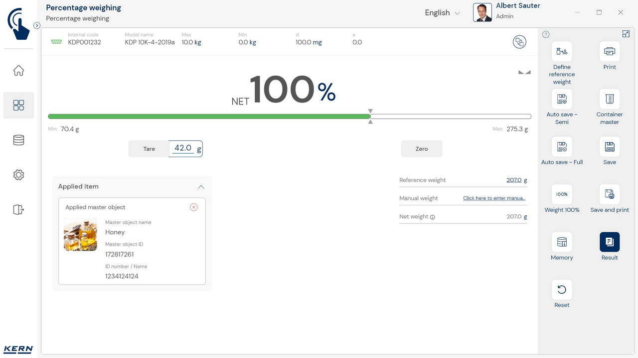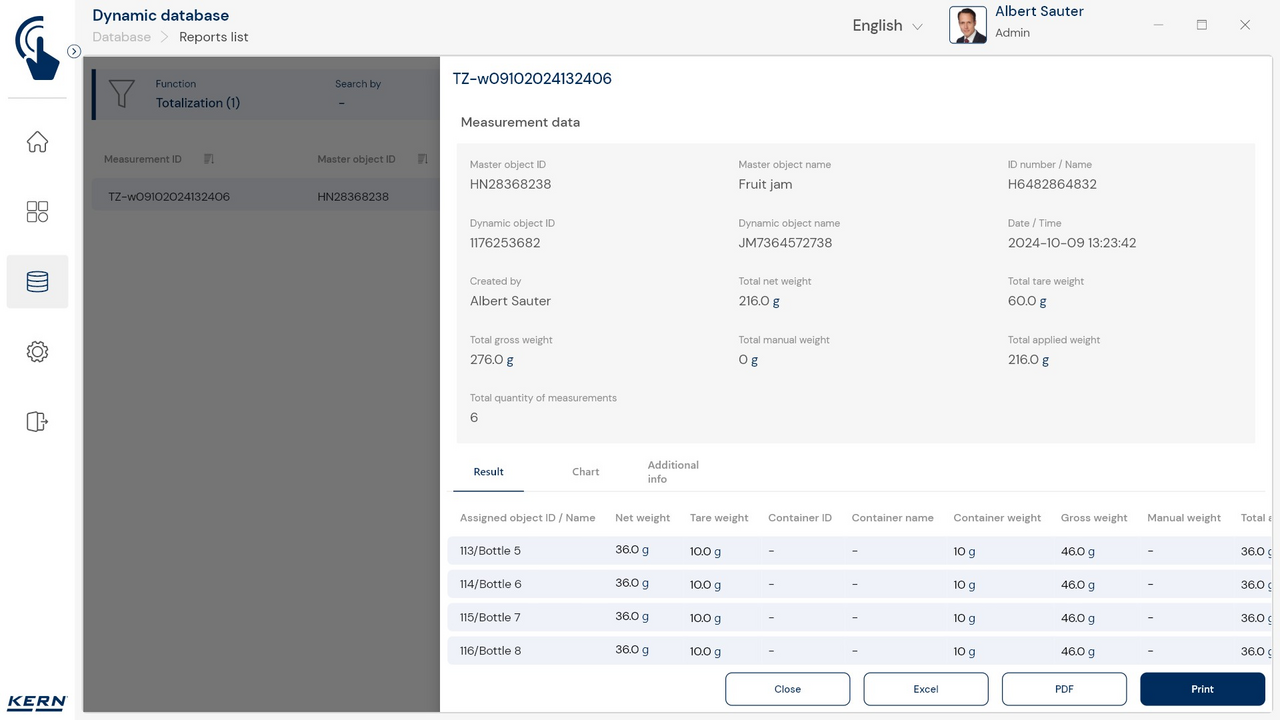 - Multi-Gerätenutzung/-verwaltung: Es ist möglich, während eines Arbeitsvorgangs zwischen verschiedenen Waagen auszuwählen, also z. B. zwischen hochlastige Waagen für grobe Messungen und Präzisionswaagen für feine Messungen (Wiegesystem/Zählsystem). Die Messergebnisse aller Waagen werden in einem einheitlichen Ergebnisprotokoll gespeichert, einschließlich deren Herkunft (Normkonformität 21 CFR Part 11, u. a.)