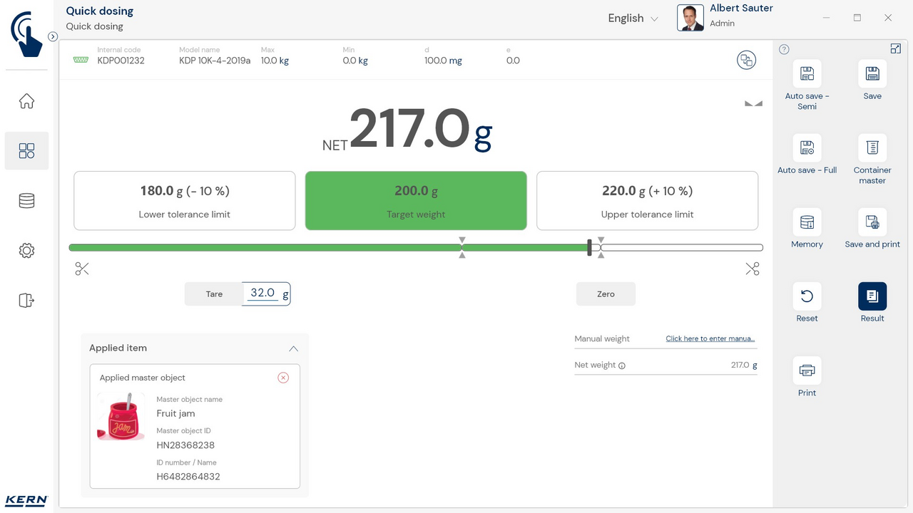 - Dosier-Assistent: Ermöglicht die Eingabe eines Zielgewichtswertes und einer erlaubten Toleranz. Beim Einwiegen gibt das System dem User optische und akustische Rückmeldung zur Erreichung des Zielgewichts. Die optische Rückmeldung wird durch ein intelligentes Balkendiagramm mit Auto-Fokus auf den Zielbereich unterstützt. Die akustische Rückmeldung erfolgt durch einen Piepton