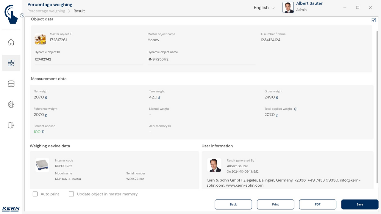 – manipulationssicher geschützte Datenspeicherung - In der Standard-Druckfunktion können neben den Mess- und Produktdaten, der Erfassungszeit und den Gerätedetails auch Benutzer- und Firmendaten übersichtlich zusammengestellt und für den Ausdruck ausgewählt werden. Zusätzlich kann eine Kopf- und Fußzeile hinzugefügt werden