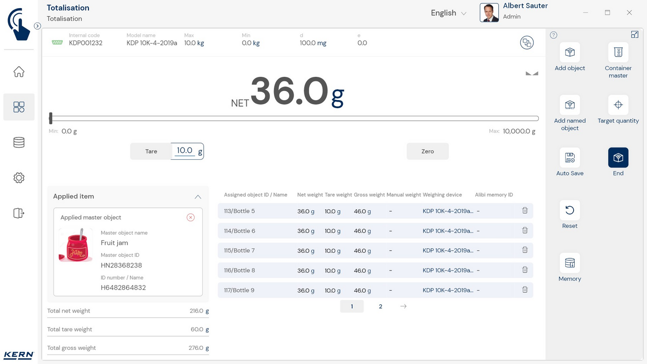 - Summieren (Rez A): Ermöglicht ein einfaches Summieren von verschiedenen Komponenten zu einer Rezeptur oder das Summieren eines Objekts, das auf verschiedene Ladungsträger verteilt ist, z. B. auf Paletten. Jedes Objekt wird für sich gewogen, die App addiert alle Einzelwerte zu einem Gesamtgewicht und weist die Einzelgewichte aus. Jedes Objekt kann im Ergebnisprotokoll individuell gekennzeichnet werden, z. B. mit einer Chargenbezeichnung oder mit Objektname/-ID aus dem Stammdatenspeicher. Besonderheit: Die Wiegungen können von verschiedenen Waagen zusammengeführt werden