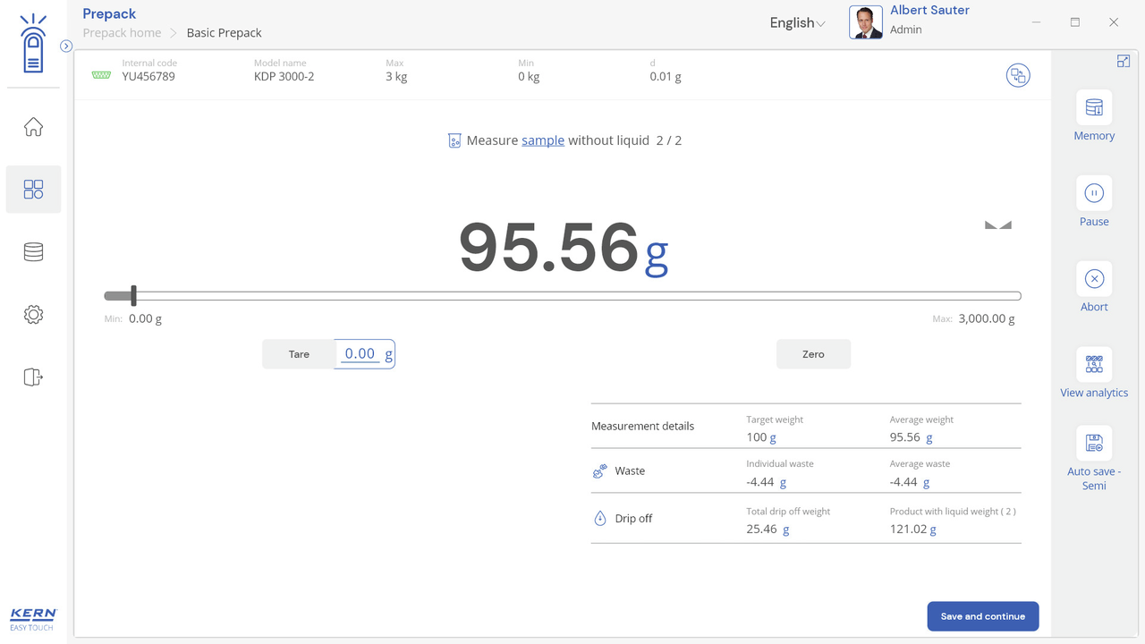 - PrePack Basic: Diese Funktion dient der schnellen Ermittlung von durchschnittlichen Füllmengen. Sie wird unter anderem zur Einstellung von Abfüllmaschinen verwendet, um die Mengen richtig zu dosieren. Jedes gewogene Objekt kann individuell erfasst werden, auch Überfüllungen (Waste) lassen sich registrieren. Bei Abtropfvorgängen wird das Abtropfgewicht von Lebensmitteln in einer Verpackung mit Aufgussflüssigkeit erfasst. Das gilt auch für tiefgefrorene Lebensmittel