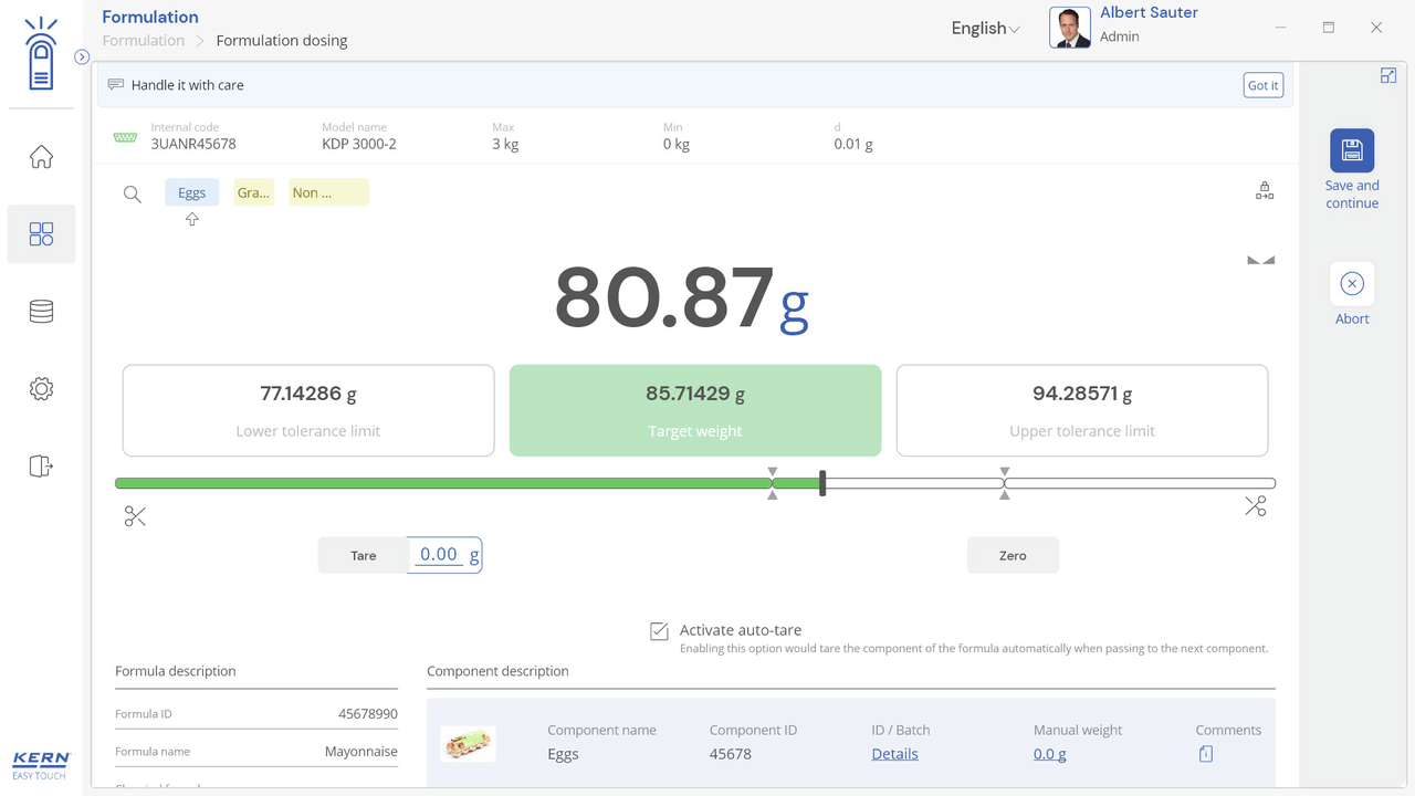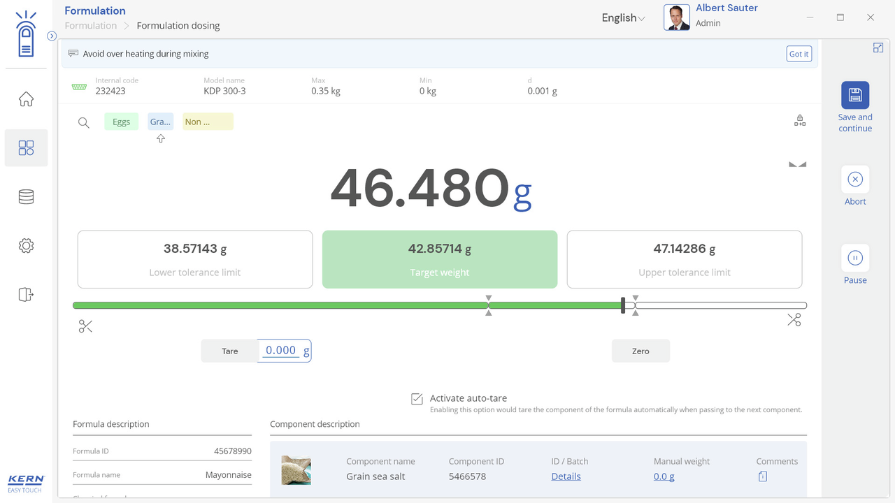 – Der Nutzer muss bei jedem Rezepturvorgang erst die Chargen-Bezeichnung der ausgewählten Komponente eingeben, bevor er diese Einwaage speichern kann