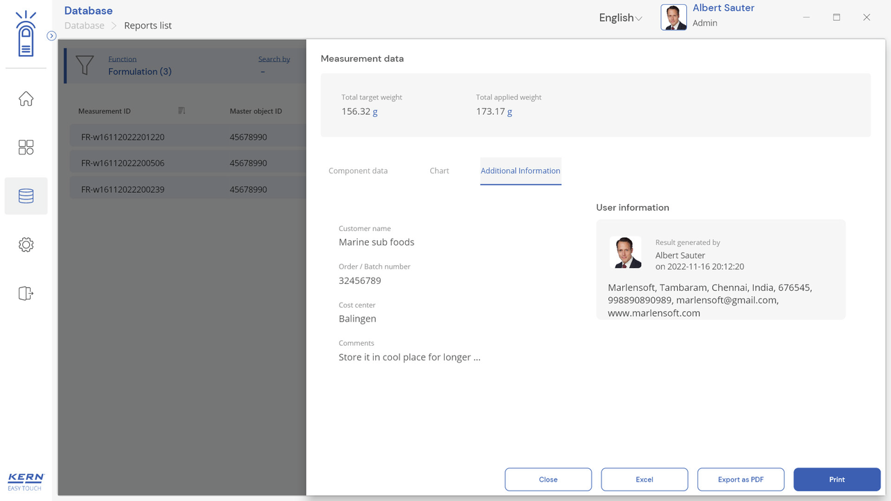 - Multi-Gerätenutzung/-verwaltung: Es ist möglich, während eines Arbeitsvorgangs zwischen verschiedenen Waagen auszuwählen, also z. B. zwischen hochlastige Waagen für grobe Messungen und Präzisionswaagen für feine Messungen (Wiegesystem/Zählsystem). Die Messergebnisse aller Waagen werden in einem einheitlichen Ergebnisprotokoll gespeichert, einschließlich deren Herkunft (Normkonformität 21 CFR Part 11, u. a.)