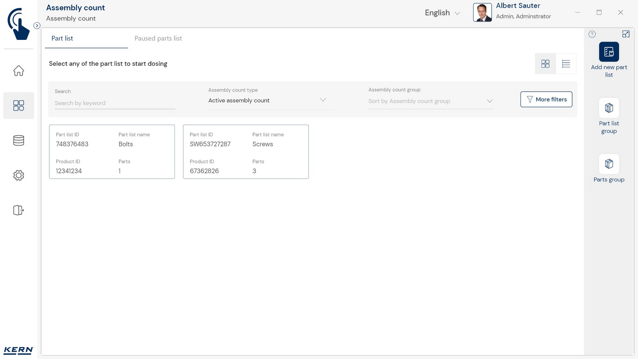 - Durch die Nutzer-Rollen-Verwaltung kann sichergestellt werden, dass die Zielmengen in den Stücklisten nur durch berechtigte Nutzer verändert werden. Da die ausführenden Nutzer zudem physisch richtig gezählte und gewogene Teilmengen abspeichern können, sind Zählfehler im Kommissionier-Prozess weitestgehend ausgeschlossen